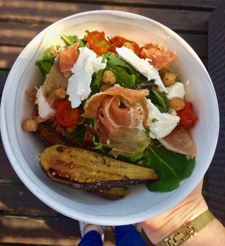 Bowl de jamón crudo, mini berenjenas asadas, queso de cabra y cherrys confit