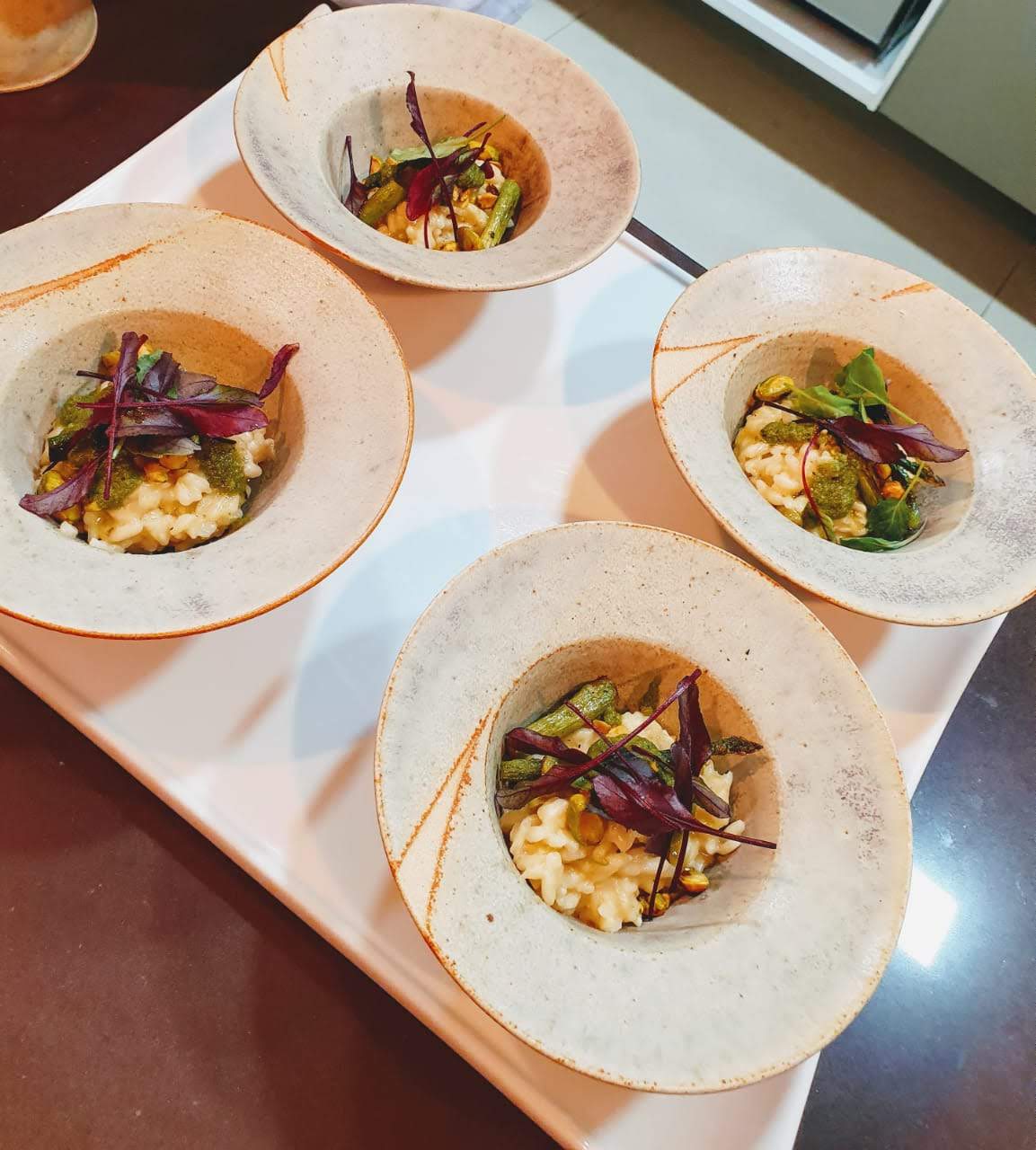 Mini Risotto de espárragos, queso de oveja, pistachos y pesto cítrico de albahaca