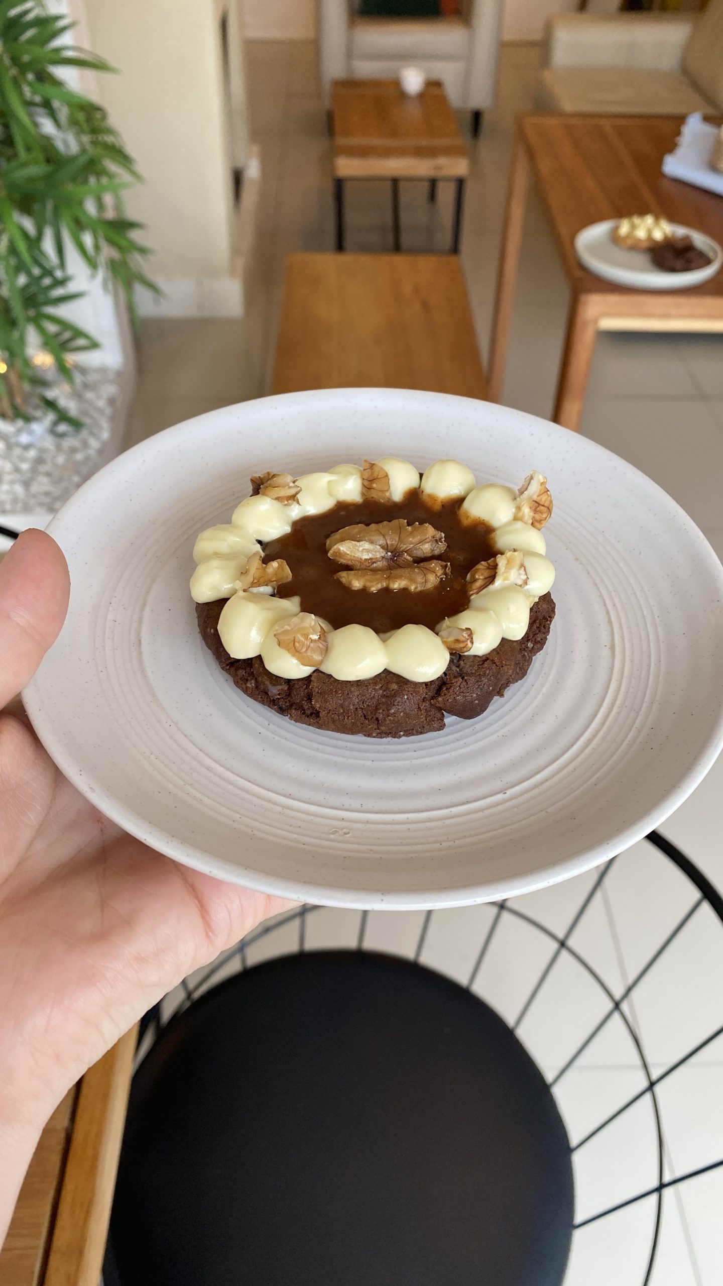 Cookie de chocolate con trozos de chocolate, estilo brownie, con nueces y crema de caramelo con un toque de sal.