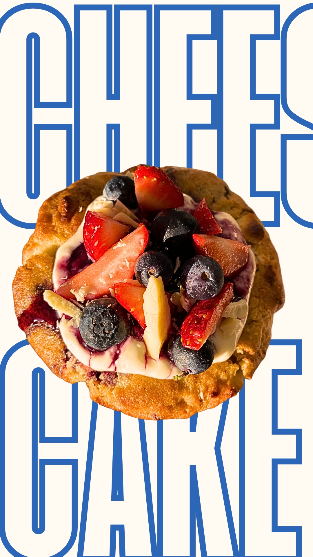 Cookie de vainilla, rellena con salsa cheescake, cubierta de frutillas, y salsa de frutos rojos