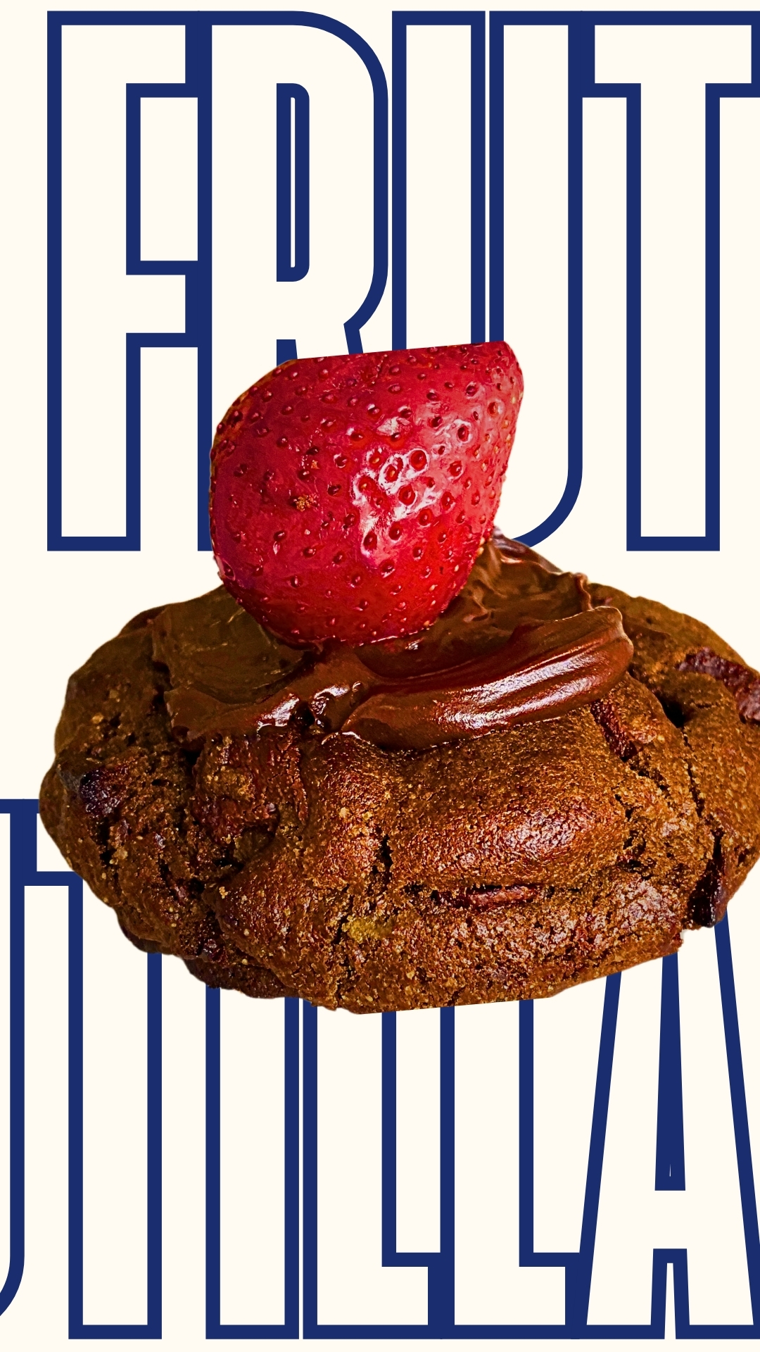 Cookie de chocolate, con trozos de chocolate, rellena de nutella, con frutilla.