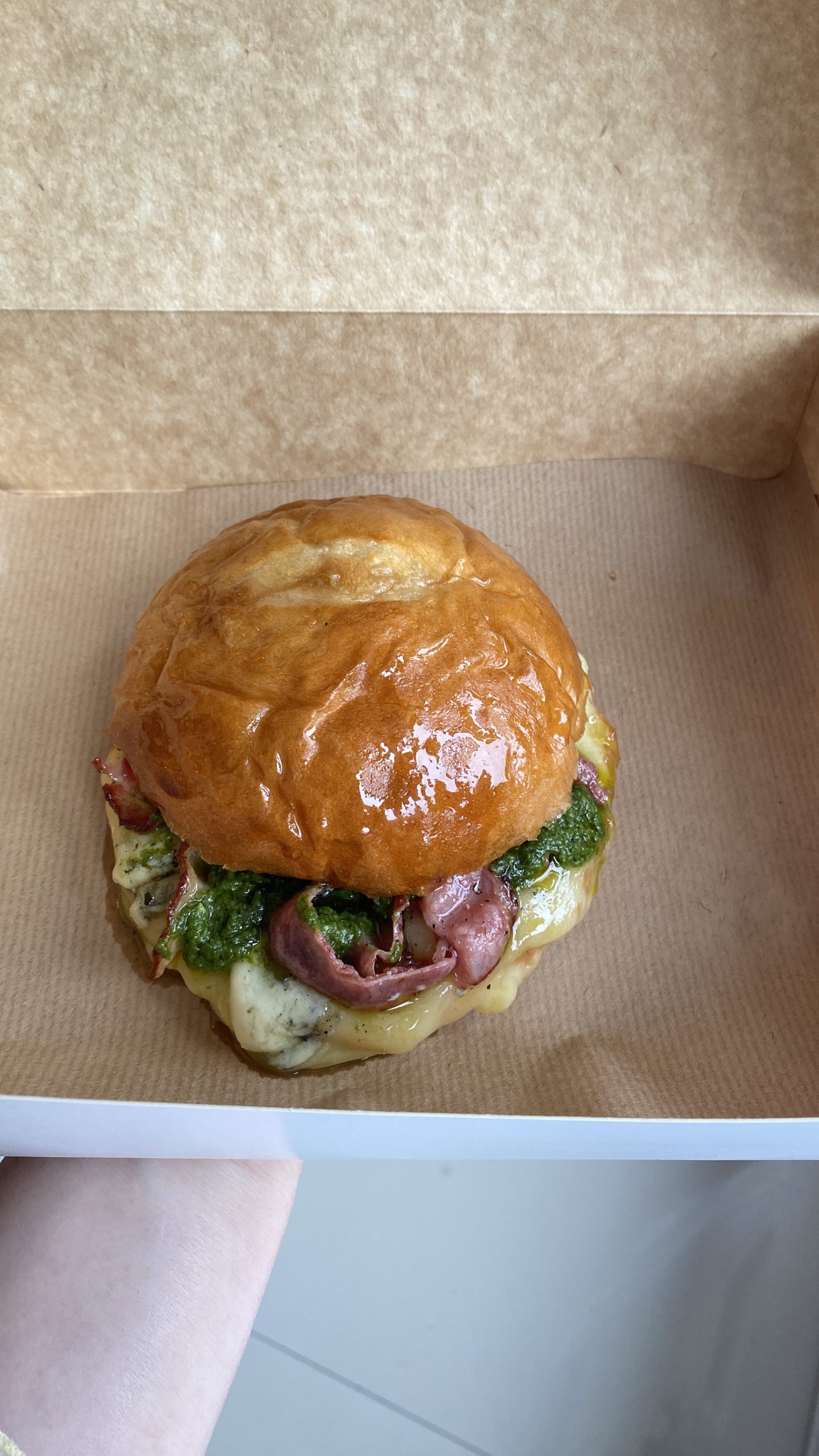 sandwiche en pan brioche francés, relleno de queso fundido, roquefort, miel de pimienta, panceta, y pesto de albahaca.